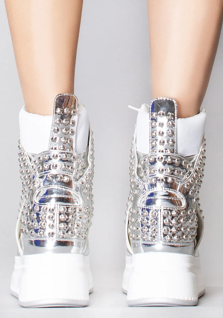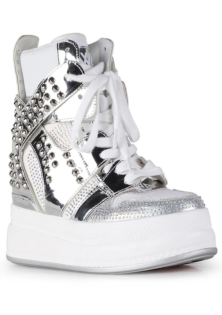 You’ll be unforgettable in the Iconic Platform Sneakers by Anthony Wang. These eye-catching platform sneakers feature a white and silver vegan leather rhinestone-encrusted upper, lace-up front, silver stud details, hidden interior wedge heel, and a platform sole that’s sure to make a statement without you even saying a word.