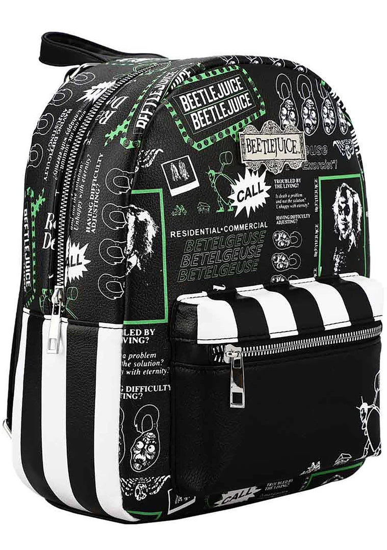 Let your evil rad side out when wearing the Beetlejuice AOP Mini Backpack from Bioworld. This rad af mini festival backpack features an all-over-printed graphic detail from the movie. It has dual adjustable shoulder straps, a top handle, and a front exterior zipper pocket. It’s showtime! #BeetlejuiceBeetleJuiceBeetlejuice