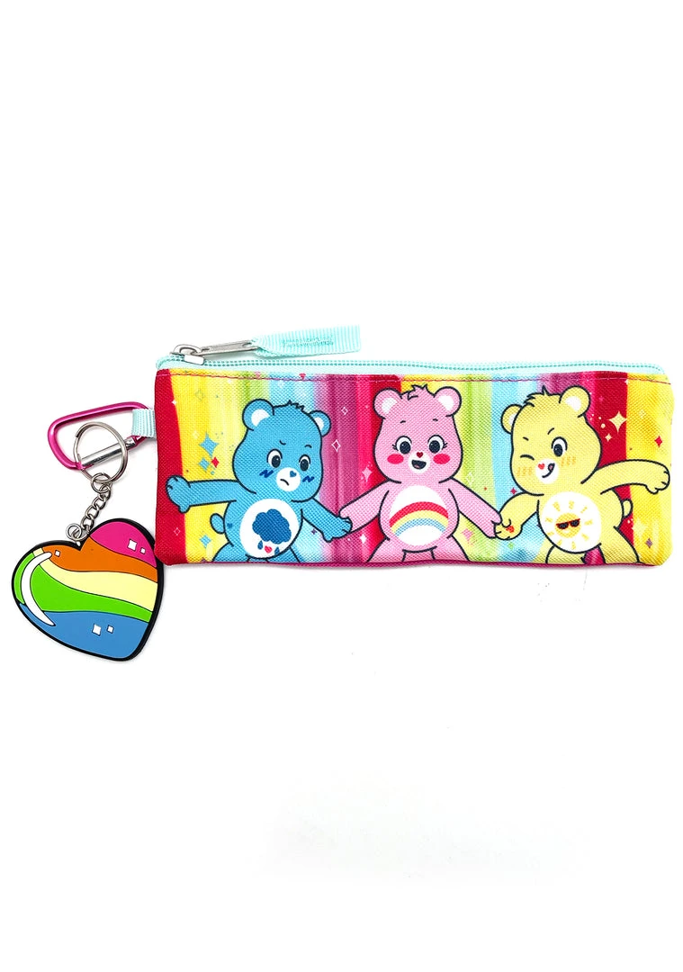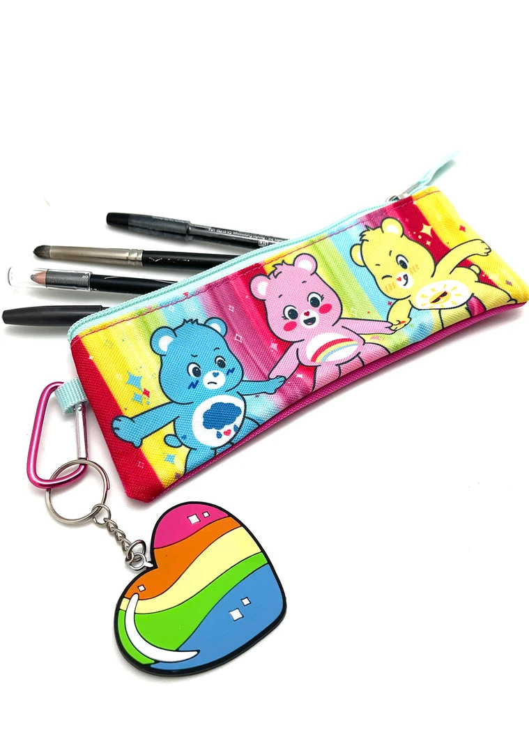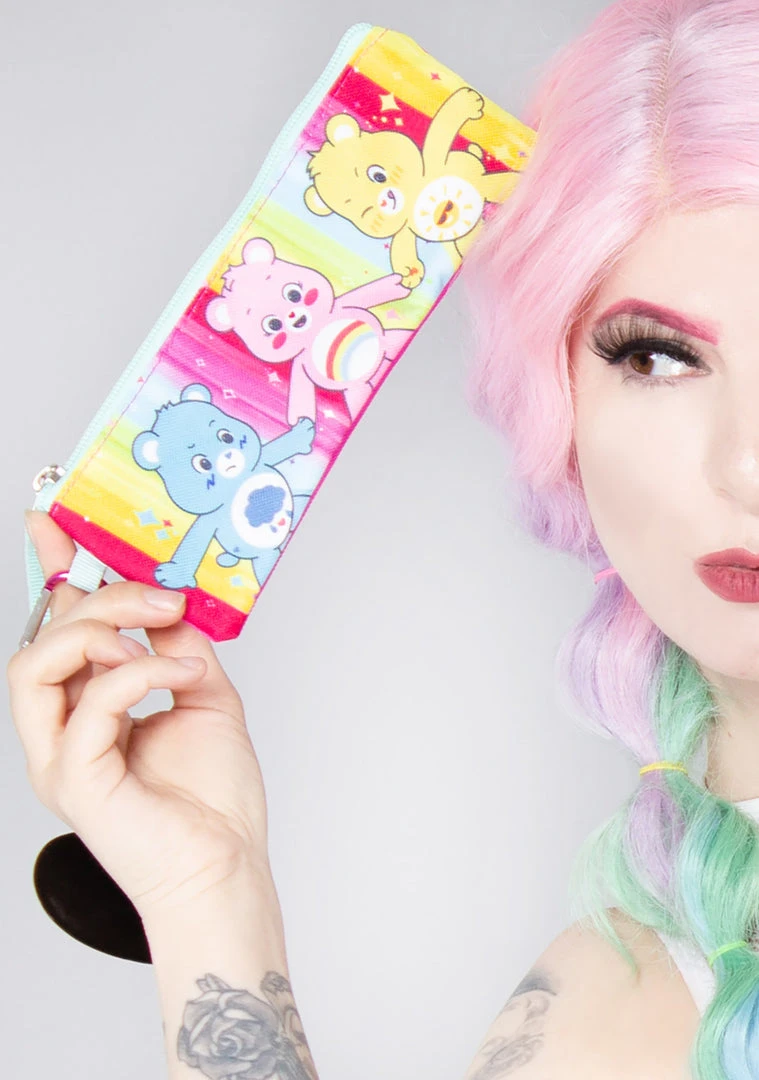 Use your light and never let darkness prevail with the Care Bears Sharing is Real Cosmetic Bag from Bioworld. These loveable festival makeup bags feature Grumpy Bear, Cheer Bear, and Funshine Bear printed on a rainbow nylon base, top zipper closure, and bonus rainbow heart key chain. With light and positivity, everything is right in the world.