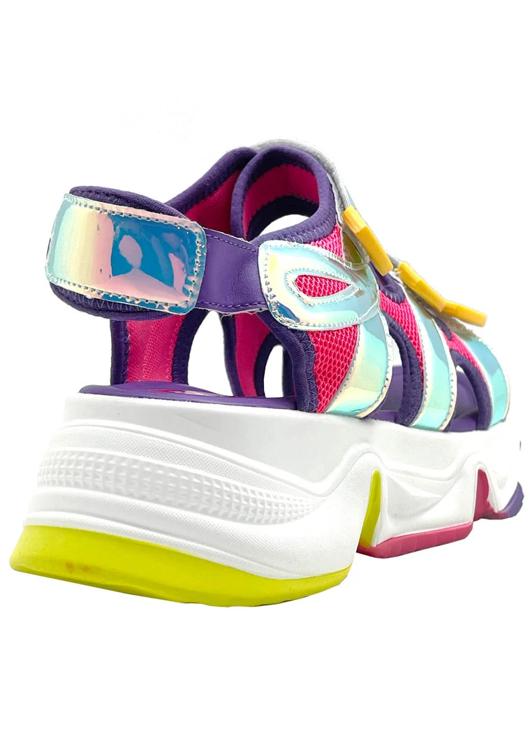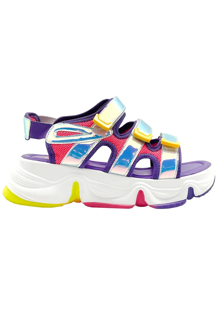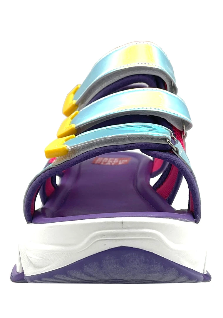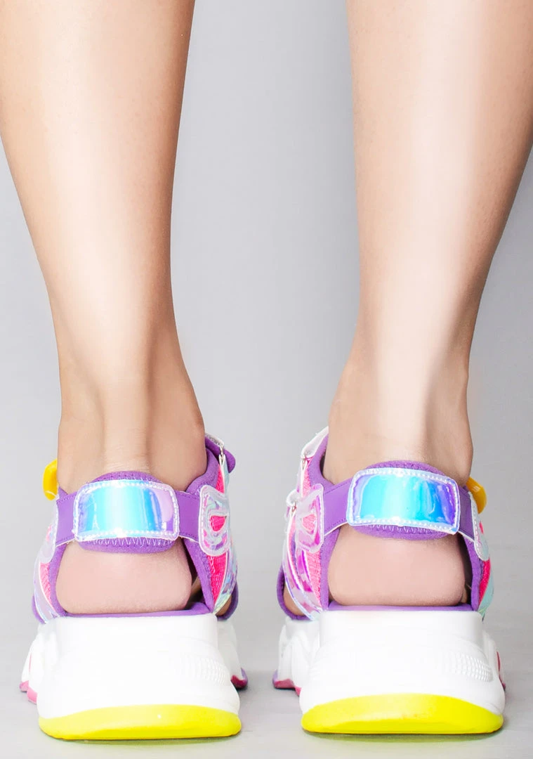 Plugin and enter your own world with the Video Kid Platform Sandals from Cape Robbin. These totally cute platform sandals feature multi-strapped purple nylon upper with holographic contrast details, vegan leather trim, a velcro strap closure, and a major traction sole. The real world is overrated.