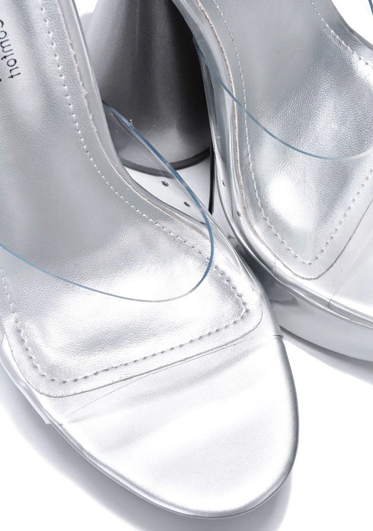 You’ll be looking your absolute best with the Flawless Platform Heels from Cape Robbin. These super sexy platform shoes for women feature a clear PVC slip-on strap upper and silver platform with a round bold heel. #flawless