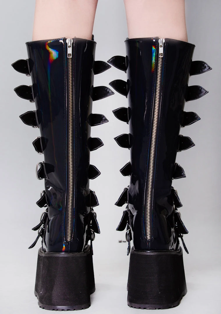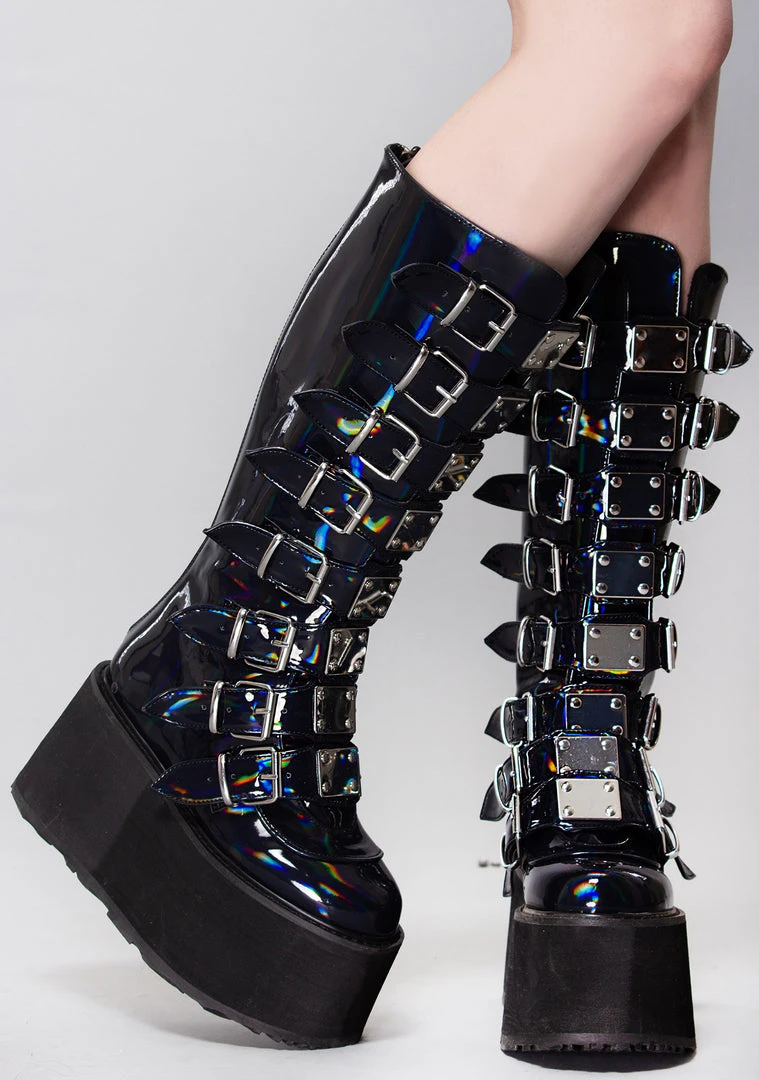 Party in your own world with the new Delusional Dream Platform Boots from Demonia. These unreal mid-calf festival boots feature a holographic black vegan leather upper, buckle up front with silver plate detail, and back zipper closure. Why live in the real world when you can just create your own?