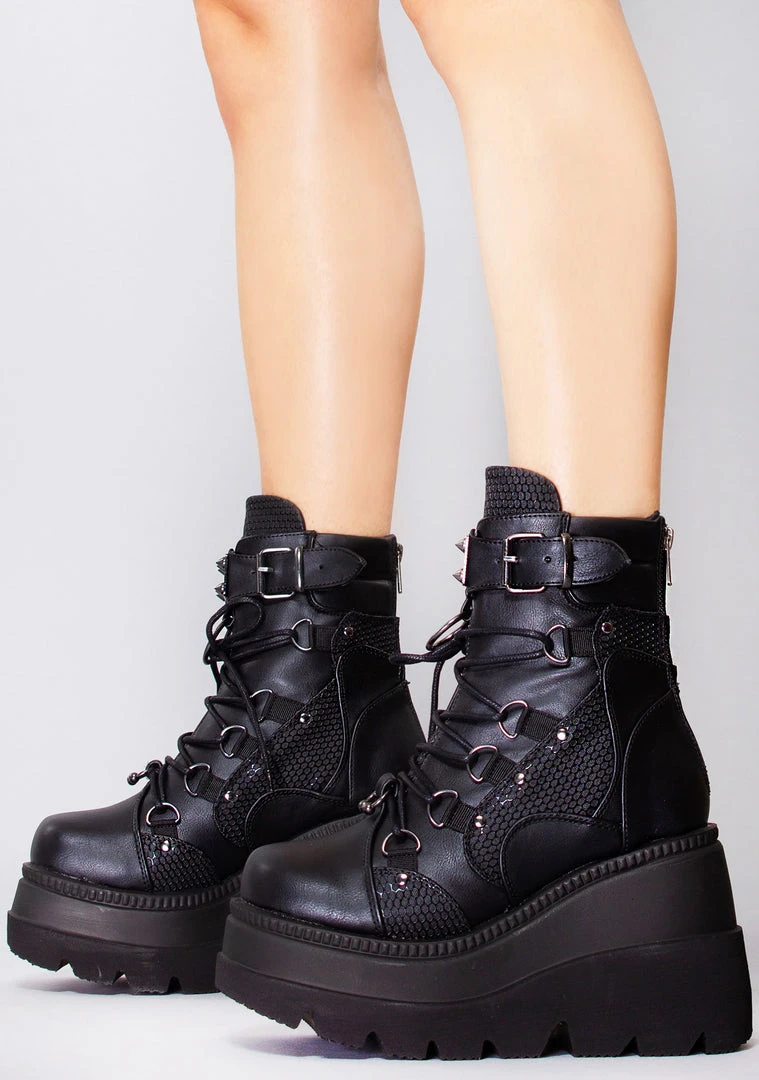 Heads will roll with the new Headhunter Platform Boots from Demonia. These savage festival boots feature a vegan leather upper, lace-up front, metal-plated buckle details, metal ring accents, and zipper closure up the back. Instead of being afraid become something to fear.