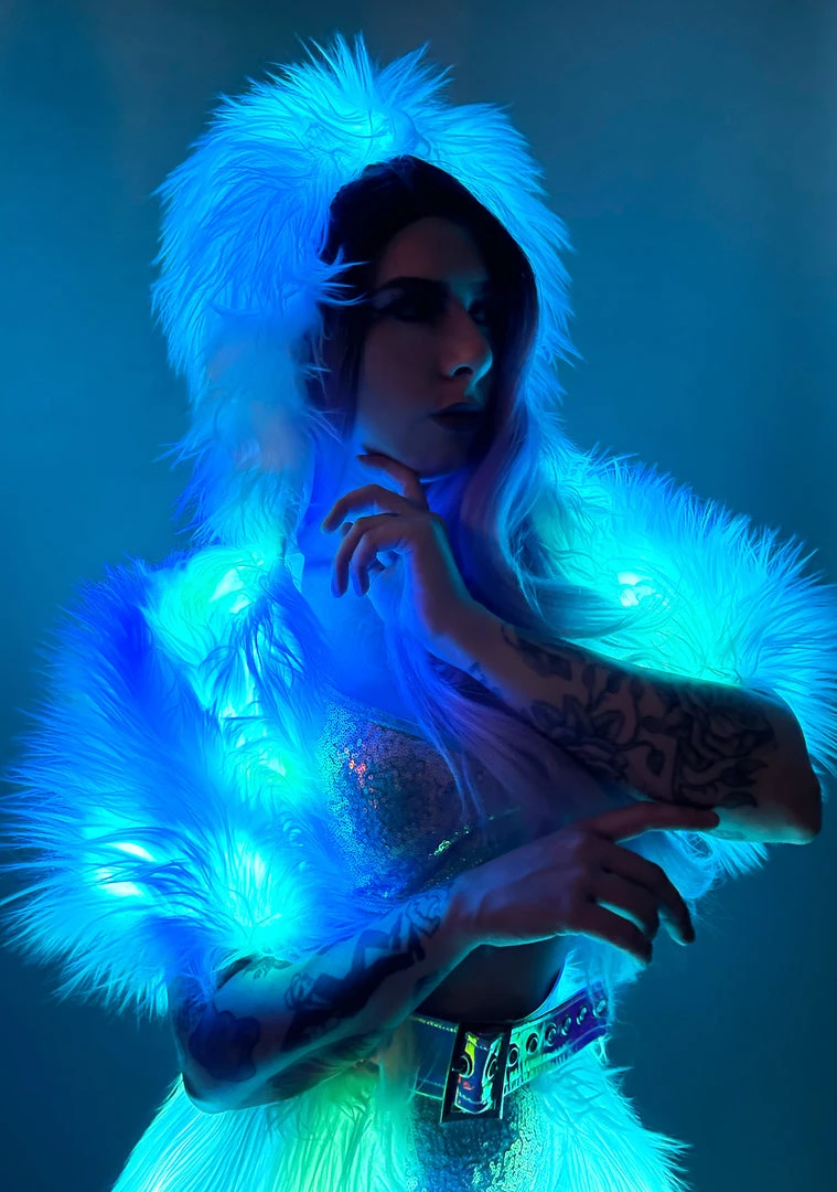 The Mystic Glow Light Up Shrug from J Valentine will have the entire dance floor under your spell. This enchanting festival jacket features an all-white faux fur shrug with built-in green and blue lights and an attached hood. Match this cute top with the Mystic Glow Light Up Belted Skirt and whisk them away to your world!