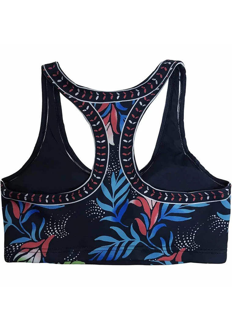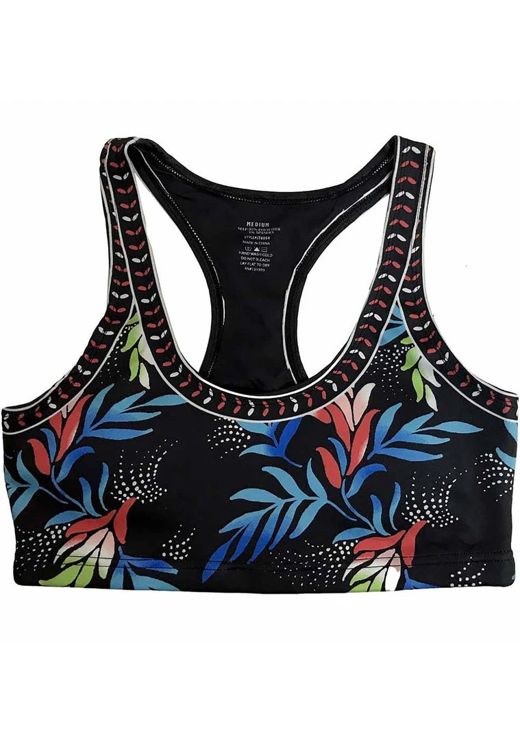 Practice yoga with style when wearing these Tropical Punch Sports Bra top. These super stretchy festival tops features a full-on tropical rainforest inspired print on super stretchy polyester base, built in bra paddings, strong elastic at bust, and open razor back detail. Complete your raver look with by pairing this top with our Scuba Print Shorts.