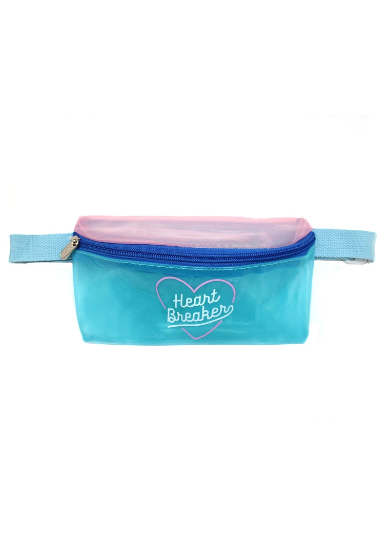 Keep all your necessities safe in this super cute Heartbreaker fanny pack from 7 LUXE. This cool fanny packs features a blue and pink colored vinyl base, adjustable waist strap, silver hardware, and top zip closure.