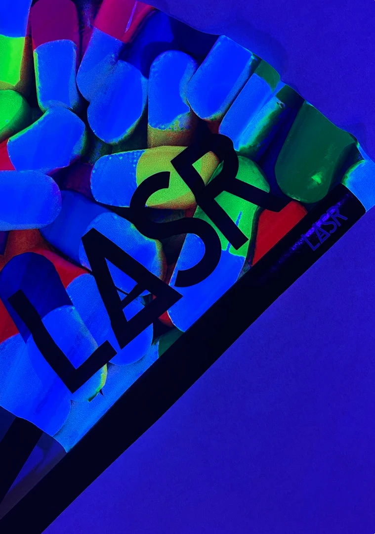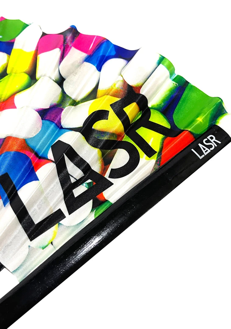 Turn up the music and change your mood! No “Derek Downers” while carrying the Happy Pills UV Reactive Rave Fan from LASR. These mood-lifting festival rave accessory fans feature neon and white-colored pills printed with UV reactive colors, a solid black bamboo rib that allows you to open and close with ease while our signature fabric gives you the loudest thwarp. This refreshingly cute fan will help you blow those bad vibes right out the window.