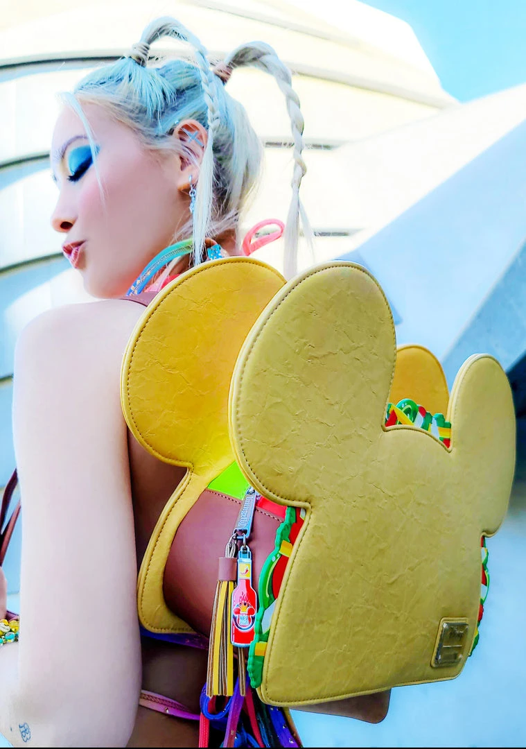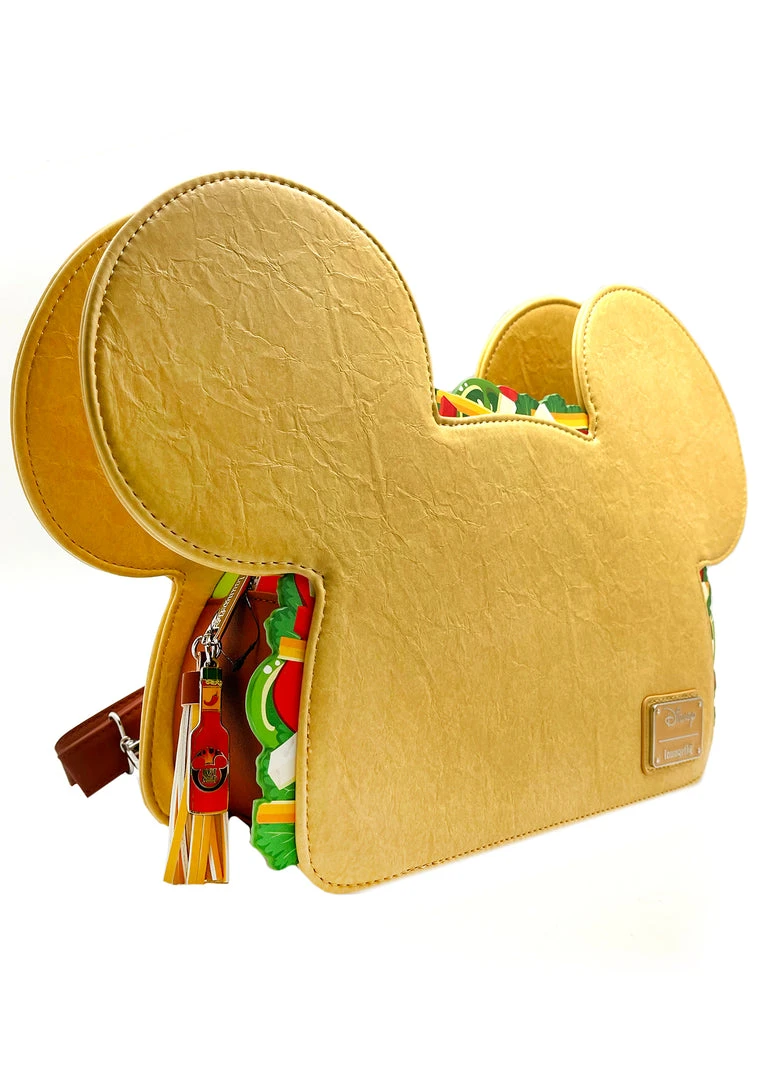 Give ’em something to taco ‘bout! The newest Loungefly x LASR Exclusive Disney Mickey Taco Convertible Mini Backpack is the hot sauce for your daily fit! This one-of-a-kind new Disney Loungefly x LA Style Rush Exclusive features a unique oversized golden taco design in the shape of Mickey’s head, complete with die-cut PU leather lettuce, tomato, and cheese! With a brown taco meat center compartment, embroidered Mickey Mouse lime squeeze back accent, fringe keychain, and metal enamel hot sauce zipper charm, this Loungefly x LASR exclusive is everything our hungry hearts and Insta feeds have been yearning for! For all our Disney-obsessed foodies, Loungefly collectors, Disney lovers, Loungefly addicts and fashion misfits this Mickey Taco bag comes both as a backpack and converts into a crossbody. Perfect accessories for Disneyland, dining out, taco truck parties, fun raves backpack, and music or food festivals, this Mickey-shaped food bag is mouth-wateringly good for any event.
