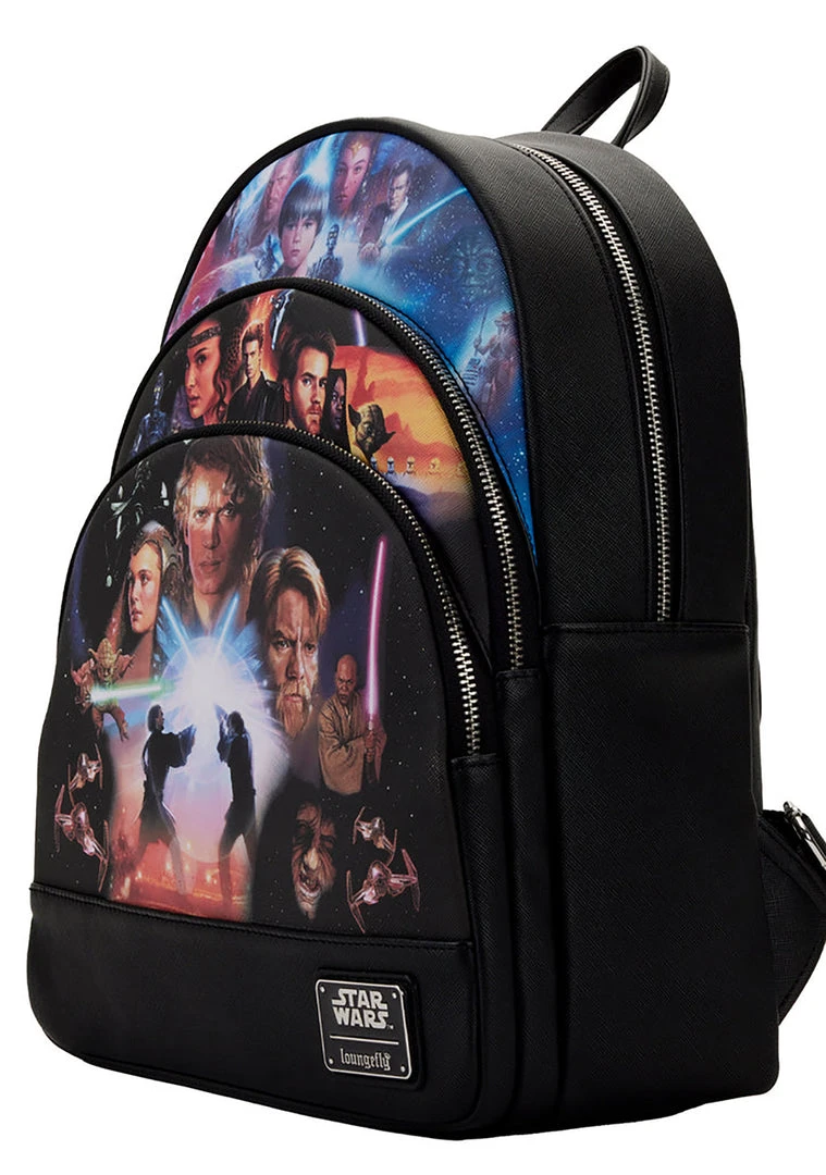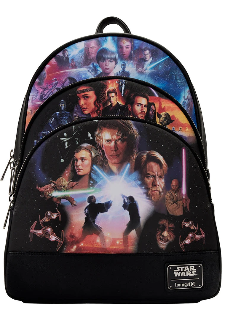 Go back to where it all began with the Star Wars Prequel Trilogy Mini Backpack from Loungefly. This epic festival bag features a vegan leather outer printed with the most iconic scenes throughout the trilogy, two zipped exterior pockets, a top handle, zip-top closure, and adjustable straps. With this cute backpack, you will have the high ground!